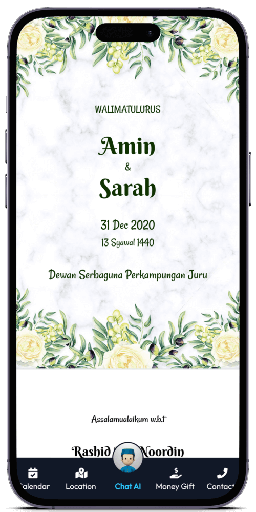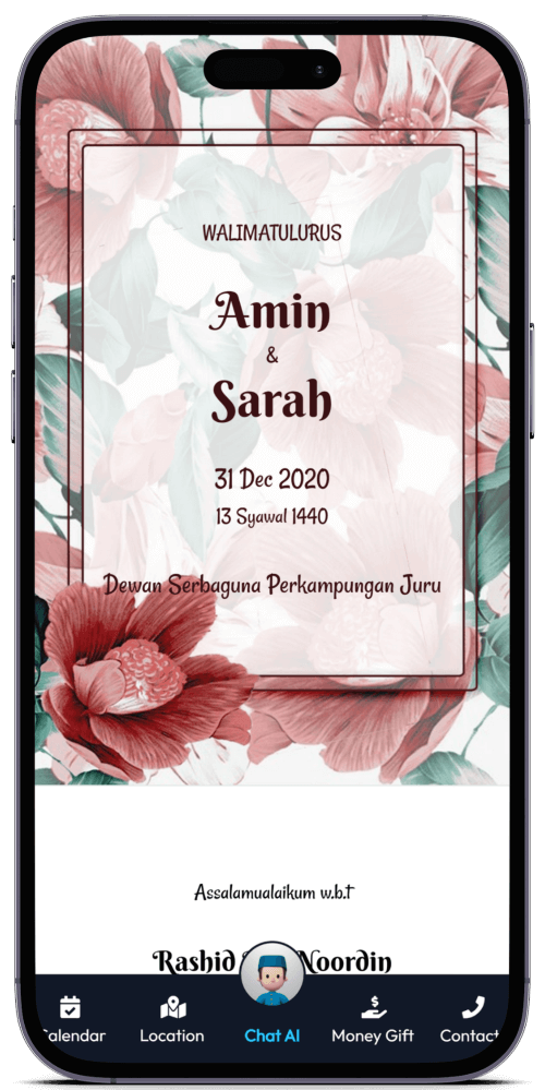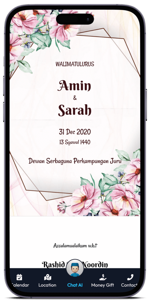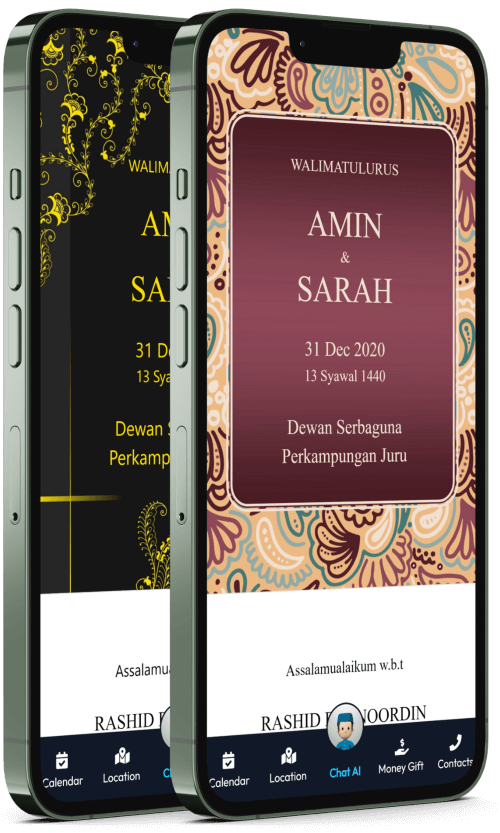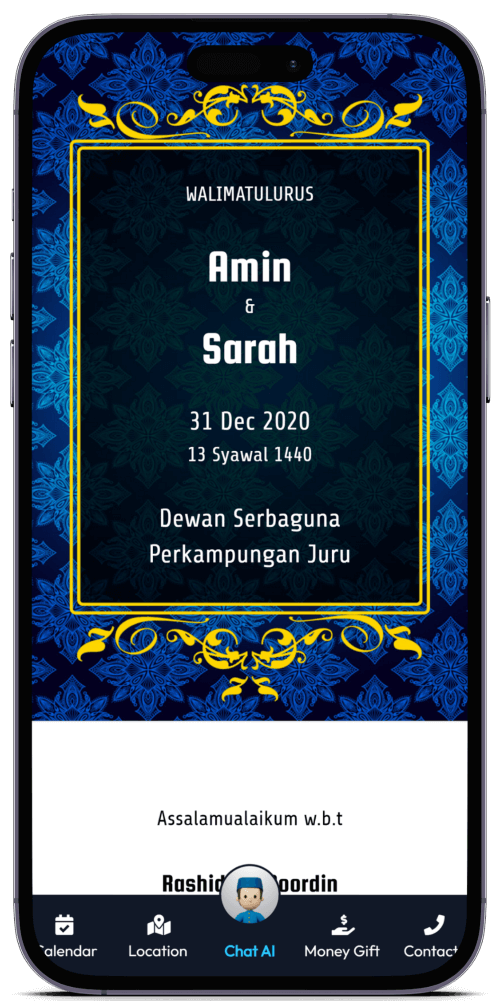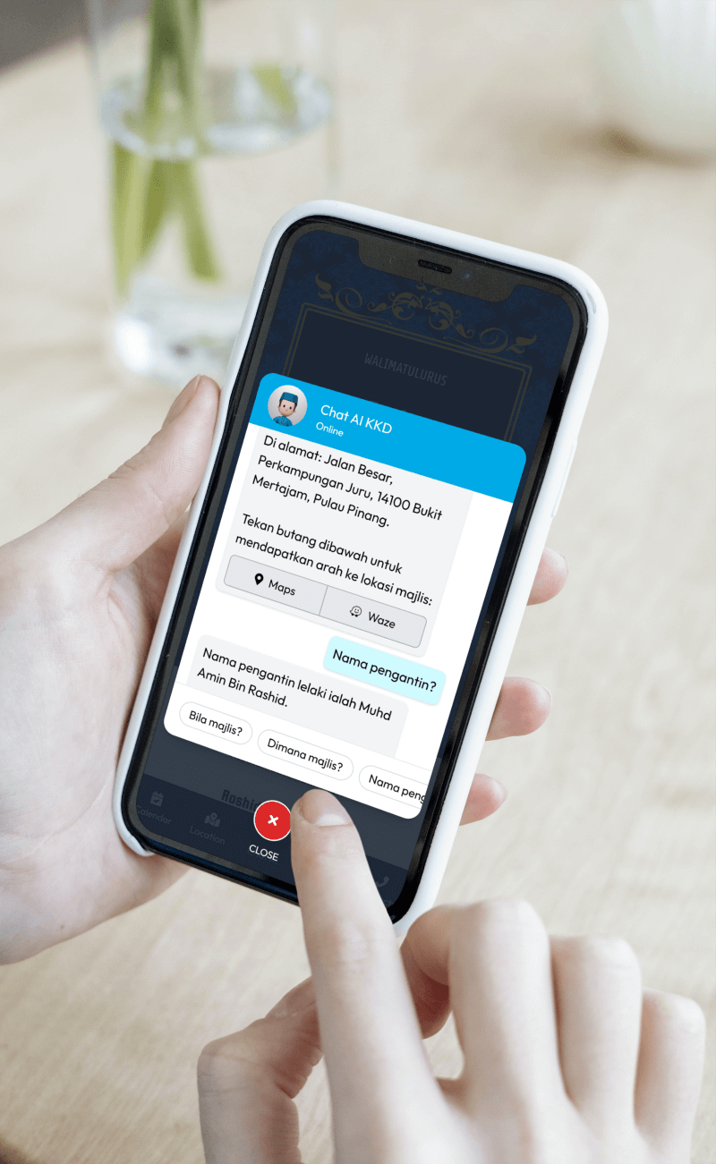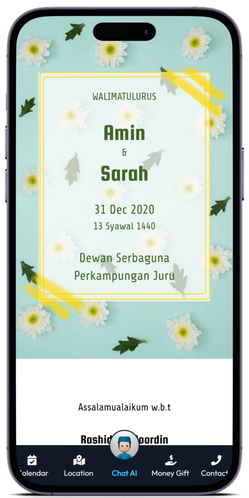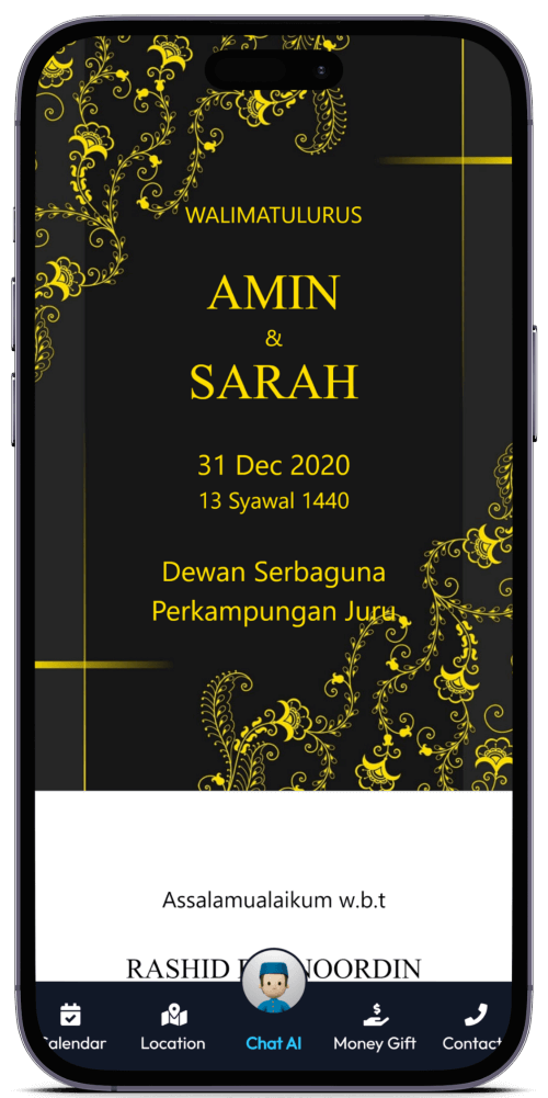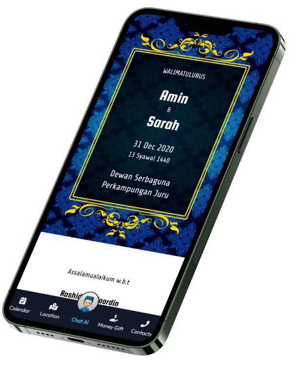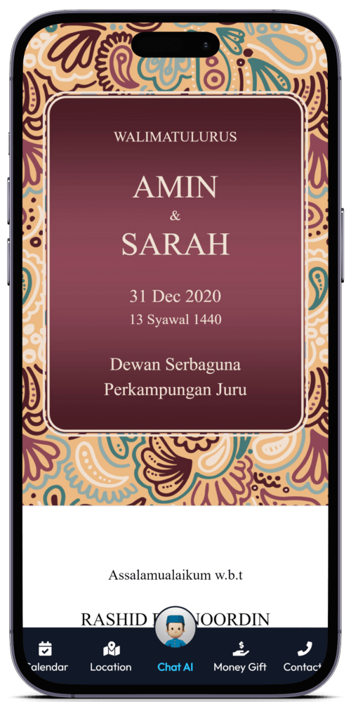 Kad Kahwin Digital pertama yang dilengkapi dengan Chat AI, chatbot yang boleh berbual dengan tetamu anda. Ia akan memberikan maklumat mengenai majlis anda dan juga boleh menjawab soalan-soalan yang sering ditanya oleh tetamu anda.